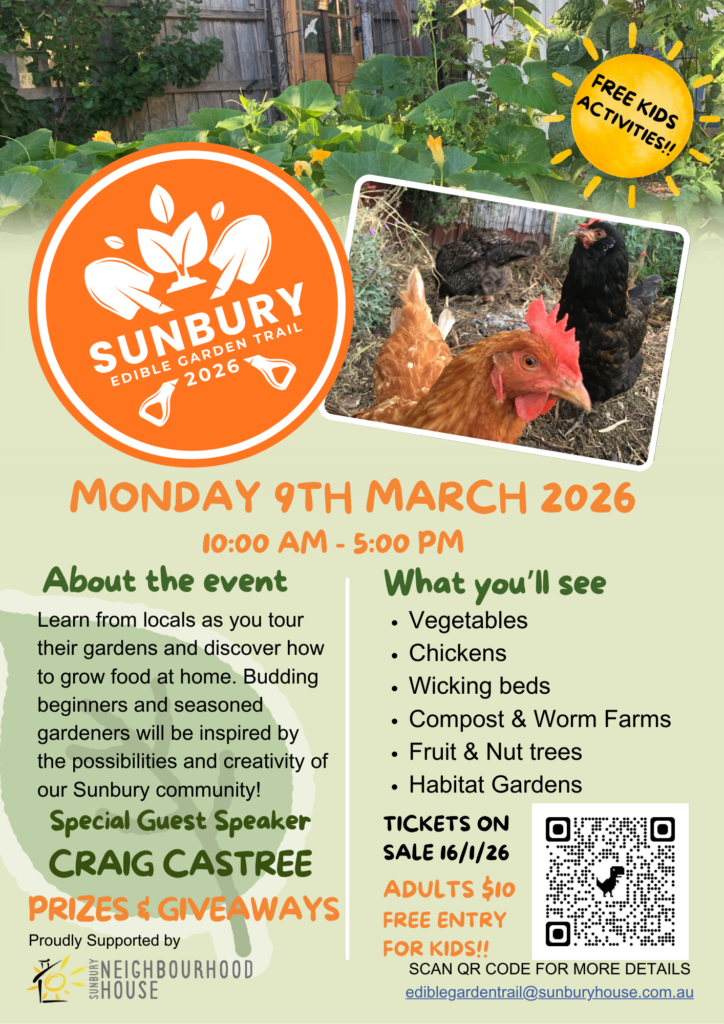 If you’d like to join local gardeners and open your growing space, please register your interest here and tell us a bit more about your patch – we’d love to hear from you! Alternatively you can email ediblegardentrail@sunburyhouse.com.au.