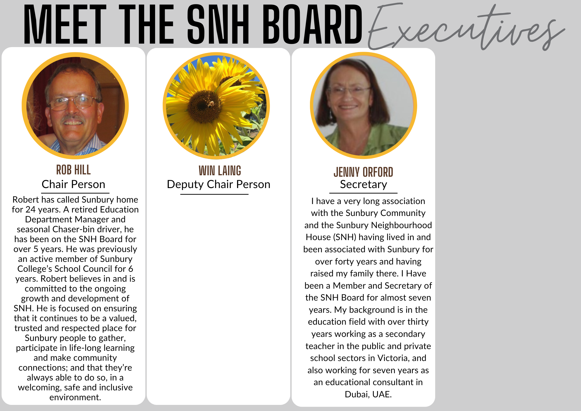 Our Team of employed staff members and our volunteer Board of Management work tirelessly to bring you the programs and opportunities available at Sunbury Neighbourhood House.